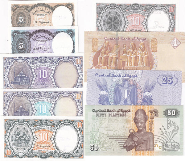 Set of 9 uncirculated banknotes - 5, 10, 25, 50 piastres, 1 pound (Pick 57, 70-71, 184-190)